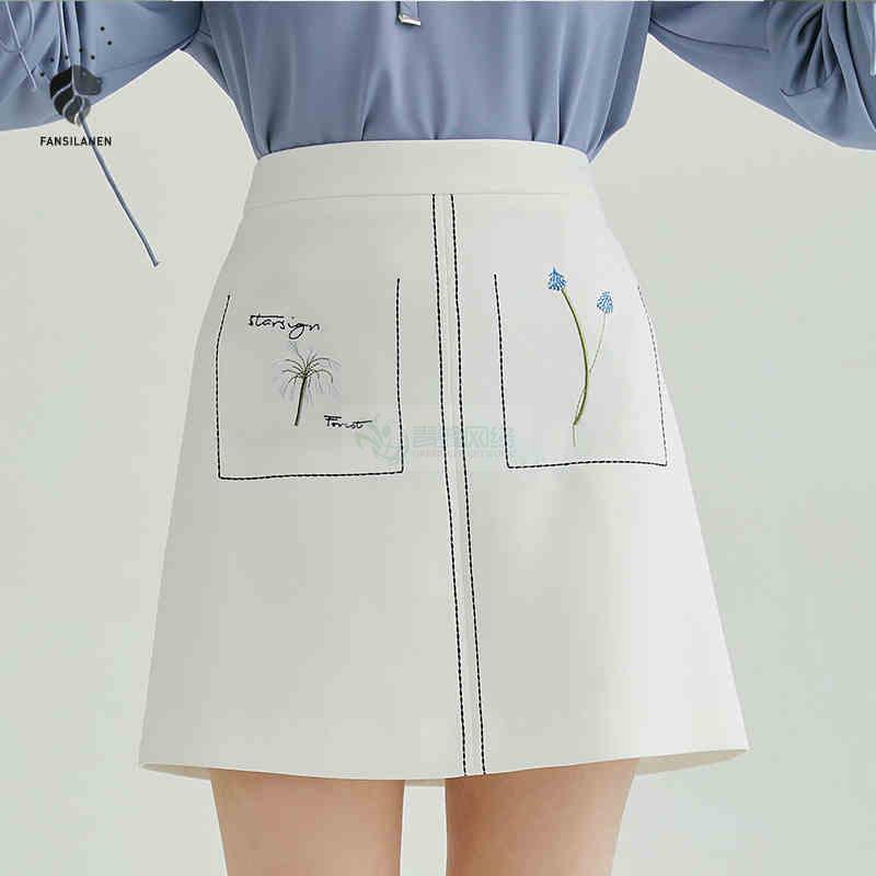 范思蓝恩刺绣A字裙子女2018春装新款高腰半身裙韩版白色印花...