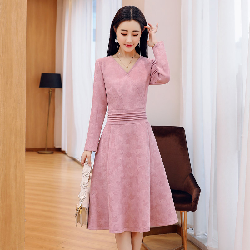 春装2018新款女装气质连衣裙V领韩版春季长袖中长款修身纯色...