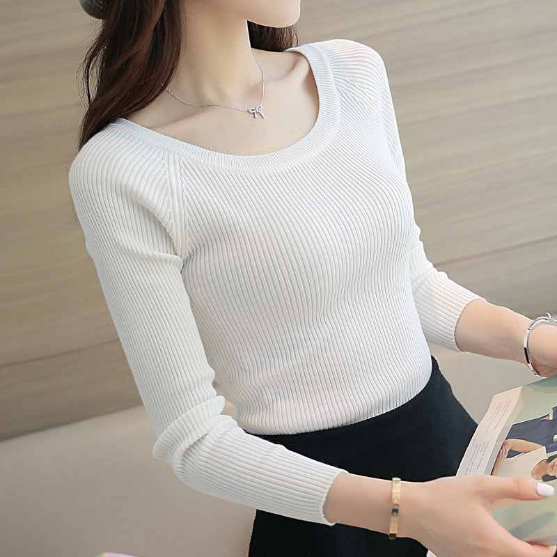 2018春秋新款韩版女装紧身打底衫修身一字领针织衫短款套头薄...